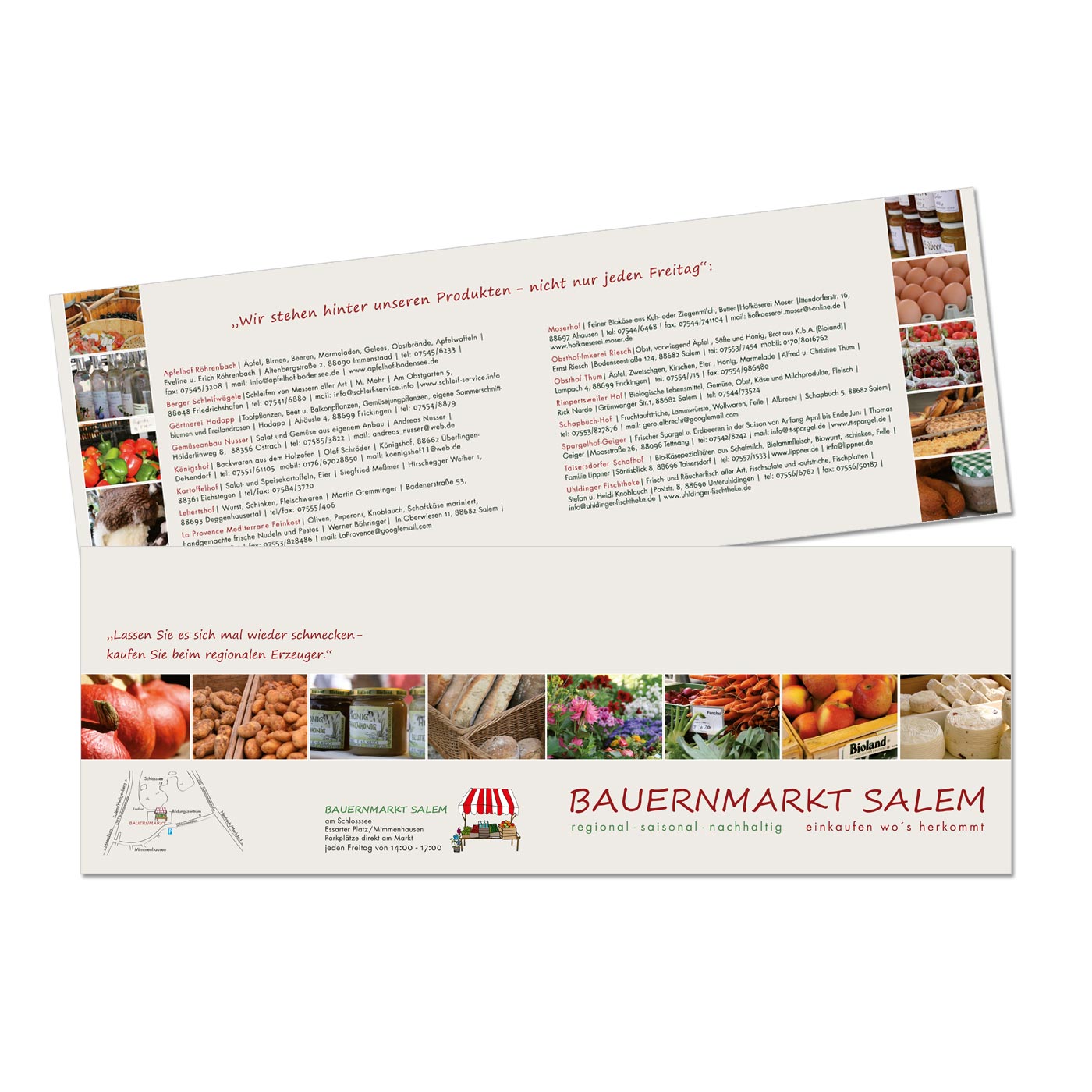Bauernmarkt Salemlogo, flyer, lakatlogologo-designBAUERNMARKT SALEMLogogestaltungZurück zu den Logosflyerflyer-designBAUERNMARKT SALEMKlappflyer DIN A5 quer, 4seitig – printZurück zu den Flyernaußenwerbungaußen-designBAUERNMARKT SALEMPlakat DIN A4/A3 – printZurück zur Außenwerbung